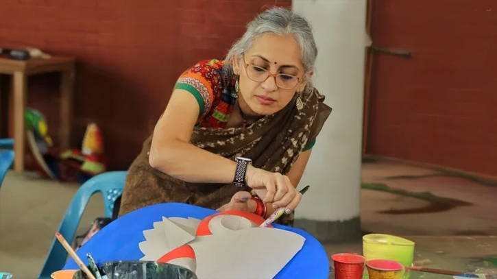 নবীন শিক্ষার্থীদের সঙ্গে কাঁধে কাঁধ মিলিয়ে আপন মনে রং করছেন মুখোশে, কখনও নকশা নিয়ে আলোচনা করছেন, কখনও আবার হাসিমুখে কারও কাজ দেখে প্রশংসা করছেন। তার উপস্থিতিতে আশপাশের পরিবেশ যেন আরও প্রাণবন্ত হয়ে ওঠে। এক শিক্ষার্থী কৌতূহল সামলাতে না পেরে প্রশ্ন ছুড়ে দেয়, ‘আপনি তো বড় তারকা, এখানে?’