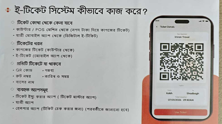 ২. সকল যাত্রীকে অ্যাপ অথবা ডিভাইসের মাধ্যমে ই-টিকেট সংগ্রহ করে গাড়িতে ভ্রমণ করতে হবে।