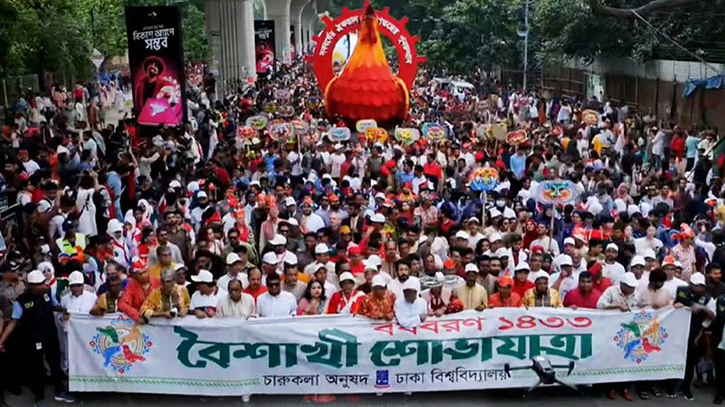 মঙ্গলবার (১৪ এপ্রিল) সকাল ১০টার দিকে শোভাযাত্রাটি ঢাকা বিশ্ববিদ্যালয়ের চারুকলা অনুষদ প্রাঙ্গণে এসে সমাপ্ত হয়। এতে কয়েক হাজার মানুষ অংশ নেন।