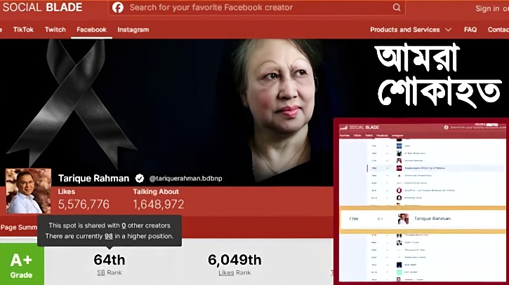 অবিশ্বাস্য এক মাইলফলক স্পর্শ করেছেন বিএনপি’র ভারপ্রাপ্ত চেয়ারম্যান তারেক রহমান। বিশ্বখ্যাত সামাজিক যোগাযোগ মাধ্যম বিশ্লেষণকারী ওয়েবসাইট ‘সোশ্যাল ব্লেড’-এর সর্বশেষ তালিকায় বিশ্বের শীর্ষ ১০০ ফেসবুক কনটেন্ট ক্রিয়েটরের মধ্যে স্থান করে নিয়েছেন তিনি। এই তালিকায় অবস্থান করে তিনি আন্তর্জাতিক পরিমণ্ডলে নিজের অনলাইন উপস্থিতির এক অনন্য নজির স্থাপন করেছেন।